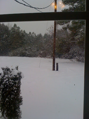 On Saturday I found out that Laurens county was supposed to get 12 inches of snow through the day Monday. I normally help out at the Es on Mondays, and I don't drive in snow, so made arrangements to go back from church with them and spend the night. Anyways a little thought made me quickly decide that if there was a choice between getting snowed in at my brothers' or the Es - the Es won out, they had a woodstove to provide heat and make coffee if we lost power....priorities:-). It became more of an adventure, when Jenny's parents, sister, and her five children also decided that this would be a better place to get snowed in.....for the same reasons I think....or at least the first reason! I figured after all of us being so prepared, we wouldn't get anything and would be left laughing at ourselves, but no, woke to six inches this morning - which by the way is a lot for SC (though I've seen much bigger storms in VA). We've had a fun and interesting day - a little different than my normal workday......hot chocolate, dressing children to play in the snow, cooking lots of food, and cuddling the baby in between loads of laundry.......and enjoying being warm and out of the weather. As I write this snow has changed to sleet, and the power lines are iced over so we may end up enjoying quite a bit of togetherness camping by the woodstove tonight. As long as I have power I'll try to update on here....